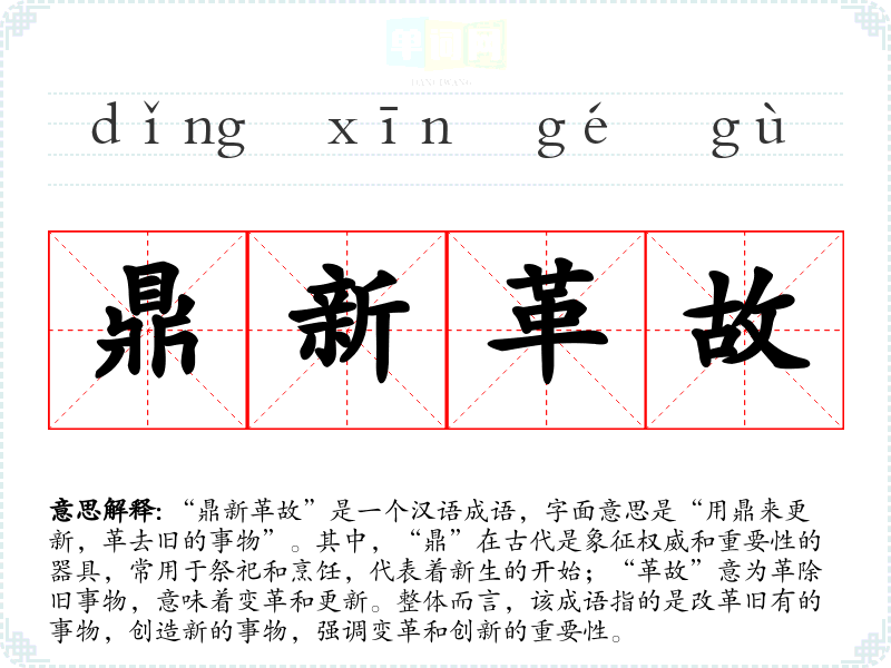 “鼎新革故”是一个汉语成语,字面意思是“用鼎来更新,革去旧的事物”。其中,“鼎”在古代是象征权威和重要性的器具,常用于祭祀和烹饪,代表着新生的开始;“革故”意为革除旧事物,意味着变革和更新。整体而言,该成语指的是改革旧有的事物,创造新的事物,强调变革和创新的重要性。