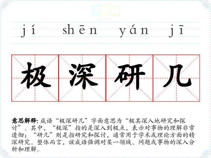 成语“极深研几”字面意思为“极其深入地研究和探讨”。其中,“极深”指的是深入到极点,表示对事物的理解非常透彻;“研几”则是指研究和探讨,通常用于学术或理论方面的精深研究。整体而言,该成语强调对某一领域、问题或事物的深入分析和理解。