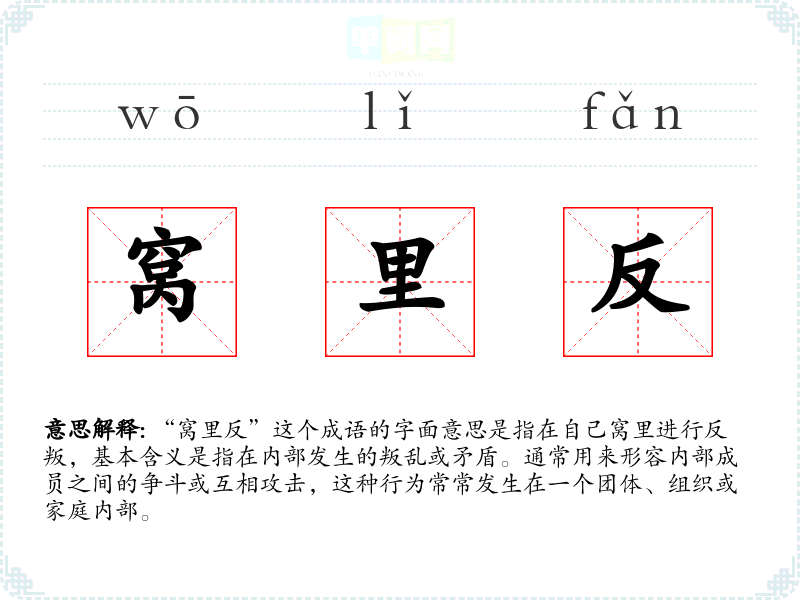 “窝里反”这个成语的字面意思是指在自己窝里进行反叛,基本含义是指在内部发生的叛乱或矛盾。通常用来形容内部成员之间的争斗或互相攻击,这种行为常常发生在一个团体、组织或家庭内部。