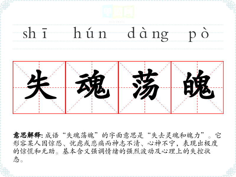 “失魂荡魄”最早见于古代文学作品,尤其是与悲伤、惊恐相关的文献中。其字面构成中“失魂”指失去理智、神志不清,而“荡魄”则有心神摇动、心神不宁的意思。这一成语反映了古代人对情感和精神状态的重视,也体现了古代文化中对心灵与身体关系的关注。