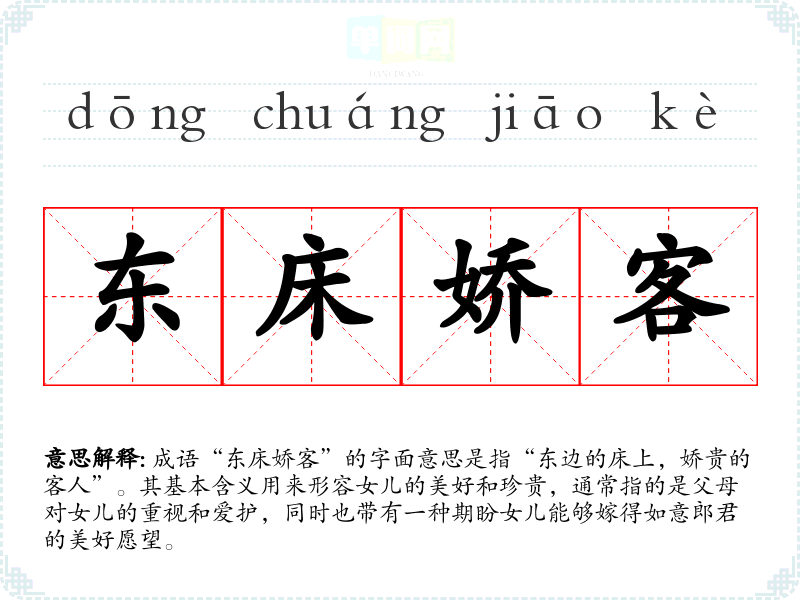 成语“东床娇客”的字面意思是指“东边的床上,娇贵的客人”。其基本含义用来形容女儿的美好和珍贵,通常指的是父母对女儿的重视和爱护,同时也带有一种期盼女儿能够嫁得如意郎君的美好愿望。