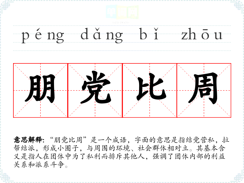 “朋党比周”是一个成语,字面的意思是指结党营私,拉帮结派,形成小圈子,与周围的环境、社会群体相对立。其基本含义是指人在团体中为了私利而排斥其他人,强调了团体内部的利益关系和派系斗争。