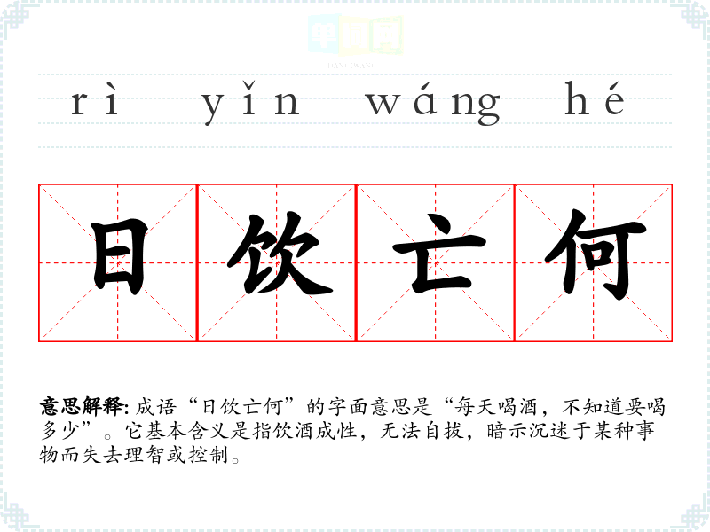 成语“日饮亡何”的字面意思是“每天喝酒,不知道要喝多少”。它基本含义是指饮酒成性,无法自拔,暗示沉迷于某种事物而失去理智或控制。