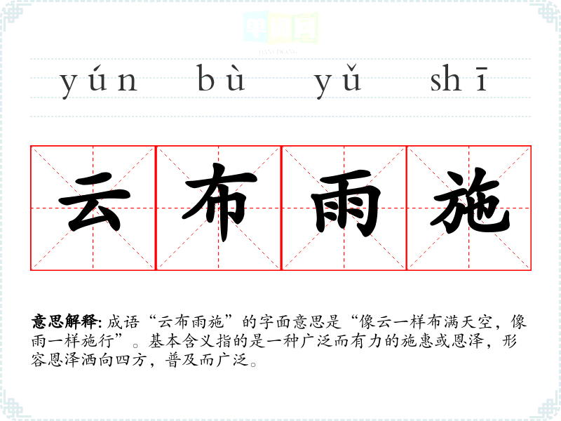成语“云布雨施”的字面意思是“像云一样布满天空,像雨一样施行”。基本含义指的是一种广泛而有力的施惠或恩泽,形容恩泽洒向四方,普及而广泛。