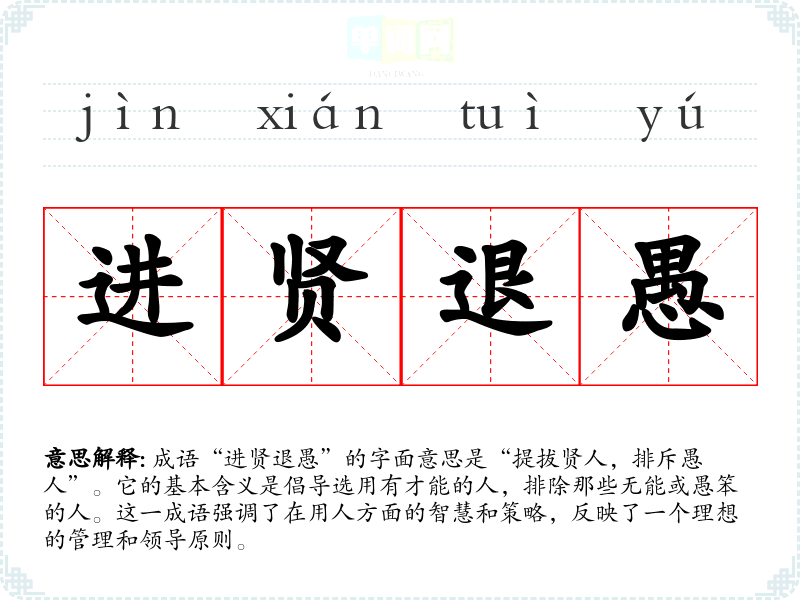 成语“进贤退愚”的字面意思是“提拔贤人,排斥愚人”。它的基本含义是倡导选用有才能的人,排除那些无能或愚笨的人。这一成语强调了在用人方面的智慧和策略,反映了一个理想的管理和领导原则。