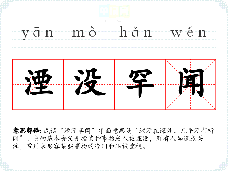 成语“湮没罕闻”字面意思是“埋没在深处,几乎没有听闻”。它的基本含义是指某种事物或人被埋没,鲜有人知道或关注,常用来形容某些事物的冷门和不被重视。