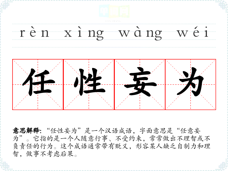 “任性妄为”并没有明确的历史典故,但它的组成部分“任性”和“妄为”分别可以追溯到古代文献。“任性”意为随心所欲,而“妄为”则表示胡乱行事。此成语反映了**文化中对自制与理智的重视,警示人们应该理智行事,避免盲目和冲动。
