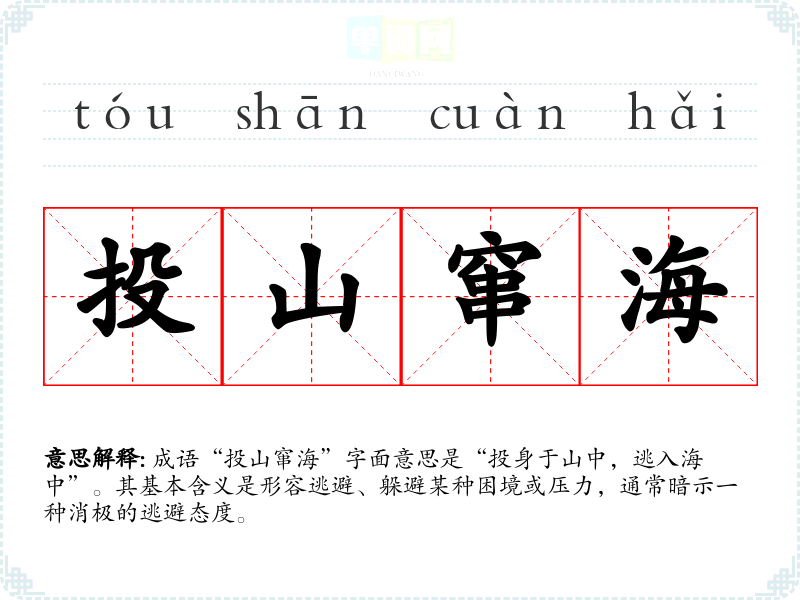 成语“投山窜海”字面意思是“投身于山中,逃入海中”。其基本含义是形容逃避、躲避某种困境或压力,通常暗示一种消极的逃避态度。