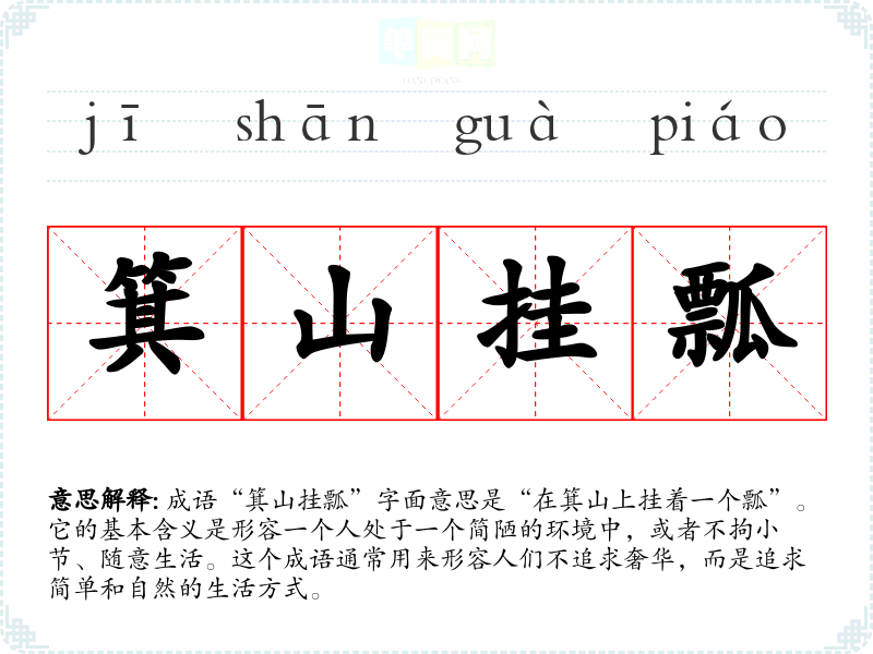 成语“箕山挂瓢”字面意思是“在箕山上挂着一个瓢”。它的基本含义是形容一个人处于一个简陋的环境中,或者不拘小节、随意生活。这个成语通常用来形容人们不追求奢华,而是追求简单和自然的生活方式。