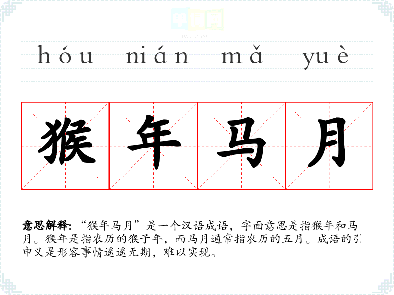 “猴年马月”是一个汉语成语,字面意思是指猴年和马月。猴年是指农历的猴子年,而马月通常指农历的五月。成语的引申义是形容事情遥遥无期,难以实现。