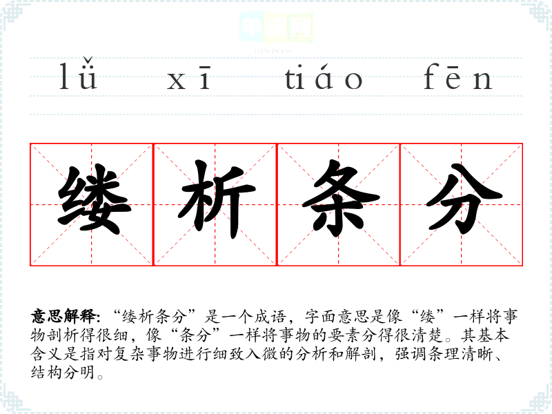 “缕析条分”是一个成语,字面意思是像“缕”一样将事物剖析得很细,像“条分”一样将事物的要素分得很清楚。其基本含义是指对复杂事物进行细致入微的分析和解剖,强调条理清晰、结构分明。