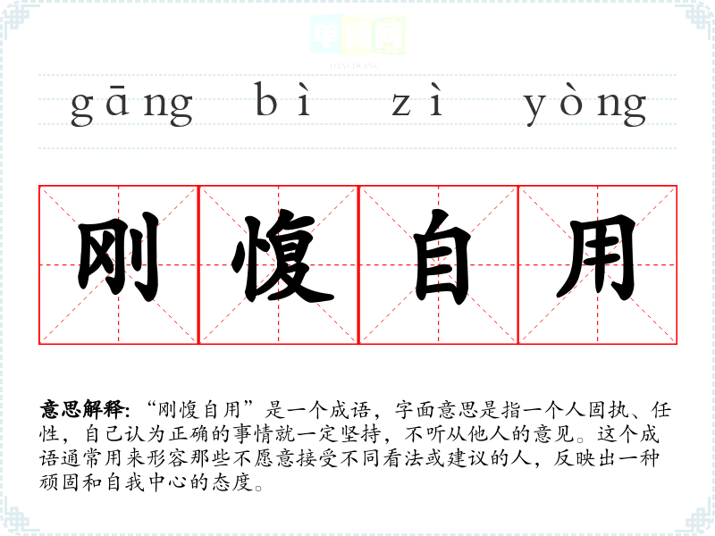 “刚愎自用”是一个成语,字面意思是指一个人固执、任性,自己认为正确的事情就一定坚持,不听从他人的意见。这个成语通常用来形容那些不愿意接受不同看法或建议的人,反映出一种顽固和自我中心的态度。