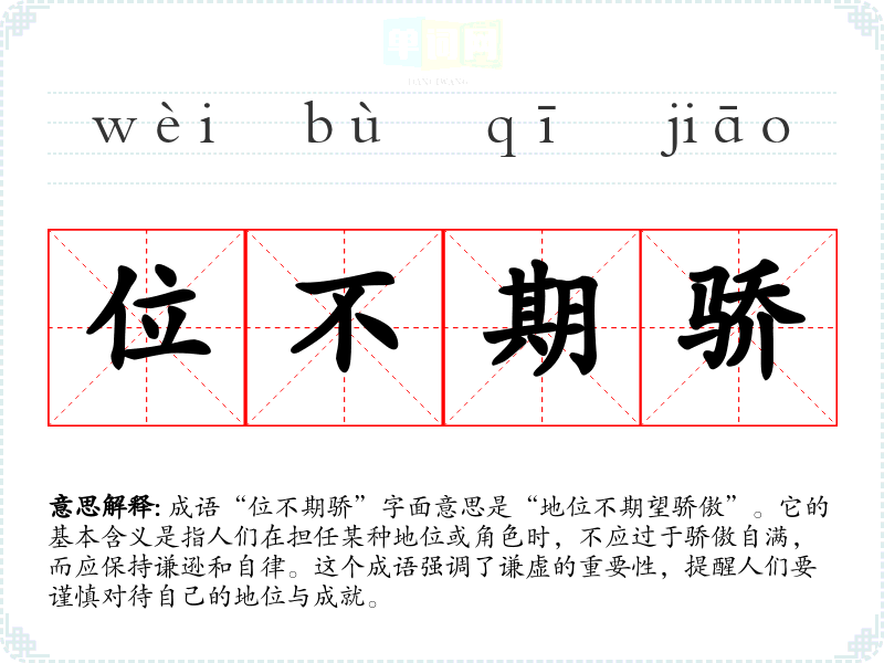 成语“位不期骄”字面意思是“地位不期望骄傲”。它的基本含义是指人们在担任某种地位或角色时,不应过于骄傲自满,而应保持谦逊和自律。这个成语强调了谦虚的重要性,提醒人们要谨慎对待自己的地位与成就。