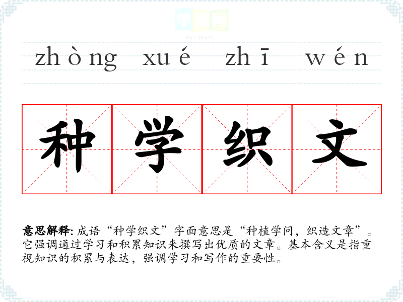 成语“种学织文”字面意思是“种植学问,织造文章”。它强调通过学和积累知识来撰写出优质的文章。基本含义是指重视知识的积累与表达,强调学和写作的重要性。