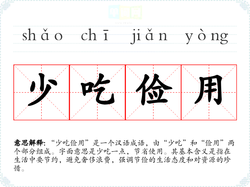 “少吃俭用”是一个汉语成语,由“少吃”和“俭用”两个部分组成。字面意思是少吃一点,节省使用。其基本含义是指在生活中要节约,避免奢侈浪费,强调节俭的生活态度和对资源的珍惜。