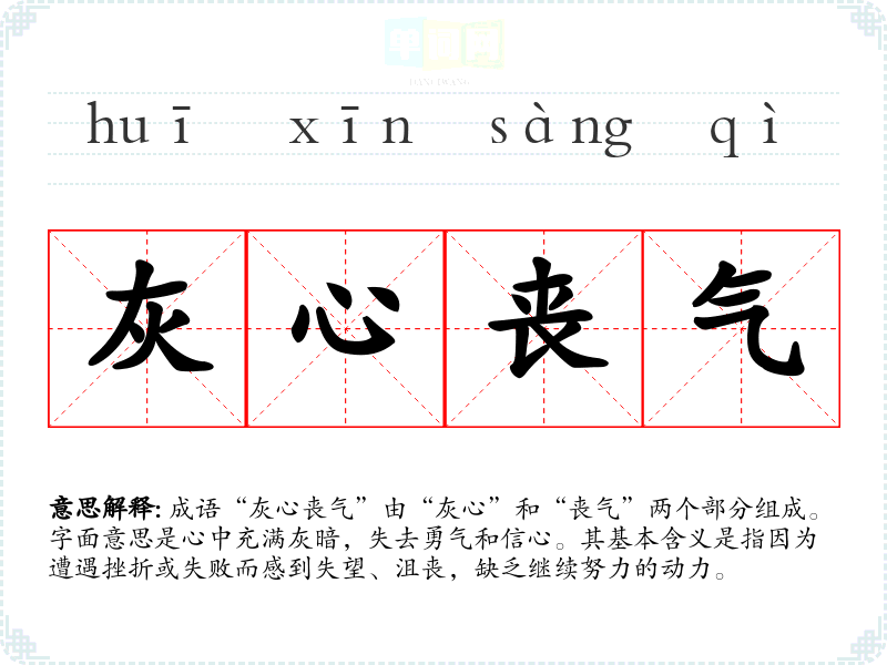 | 灰心丧意 | 犹言灰心丧气。形容因失败或不顺利而失去信心,意志消沉。 |