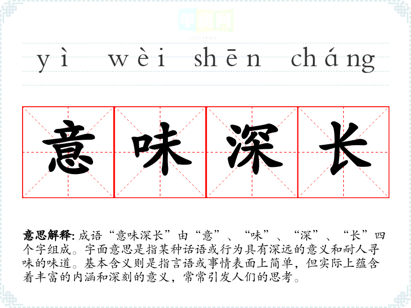 成语“意味深长”由“意”、“味”、“深”、“长”四个字组成。字面意思是指某种话语或行为具有深远的意义和耐人寻味的味道。基本含义则是指言语或事情表面上简单,但实际上蕴含着丰富的内涵和深刻的意义,常常引发人们的思考。