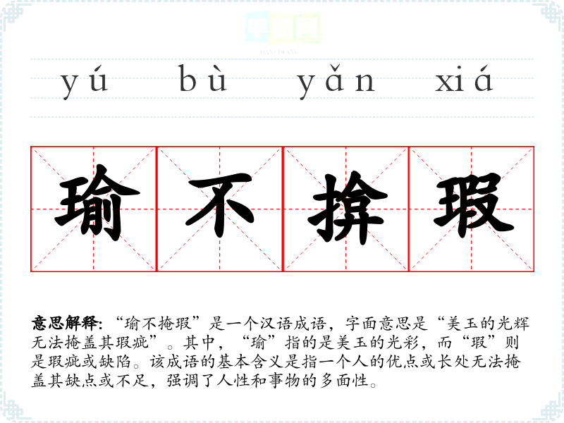 | 瑜不揜瑕 | 瑜:玉的光彩,比喻优点;瑕:玉上的斑点,比喻缺点。原指玉之性,美与恶不互相掩盖,后多比喻优点不能掩盖缺点。 |