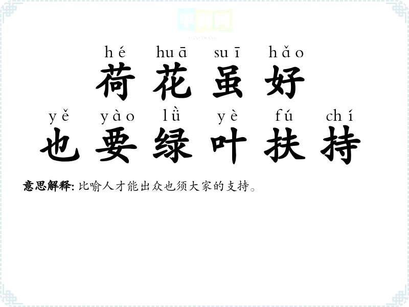 | 荷花虽好,也要绿叶扶持 | 比喻人才能出众也须大家的支持。 |
