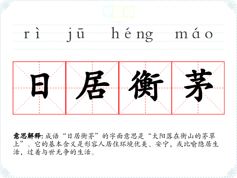 成语“日居衡茅”的字面意思是“太阳落在衡山的茅草上”。它的基本含义是形容人居住环境优美、安宁,或比喻隐居生活,过着与世无争的生活。