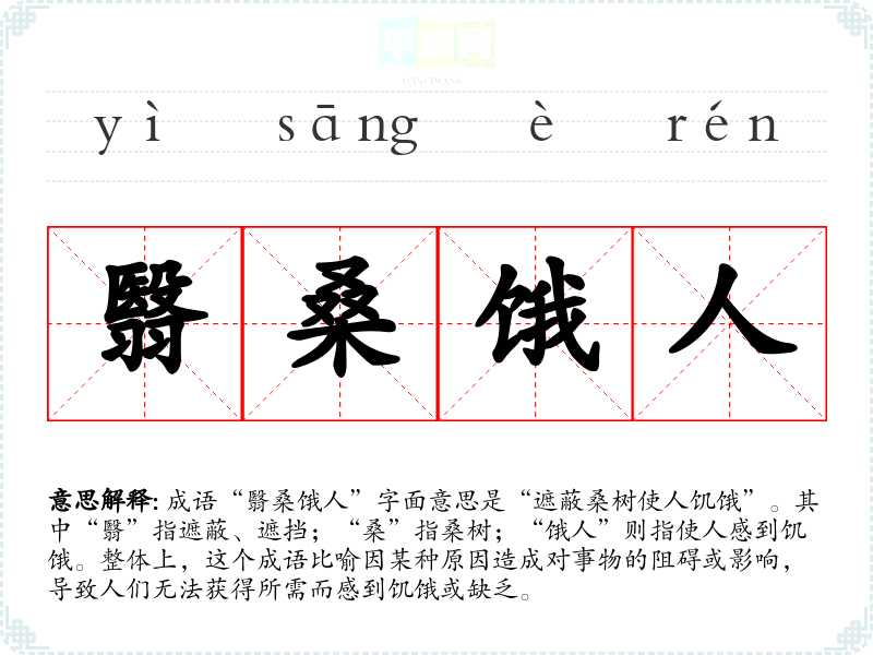 成语“翳桑饿人”字面意思是“遮蔽桑树使人饥饿”。其中“翳”指遮蔽、遮挡;“桑”指桑树;“饿人”则指使人感到饥饿。整体上,这个成语比喻因某种原因造成对事物的阻碍或影响,导致人们无法获得所需而感到饥饿或缺乏。
