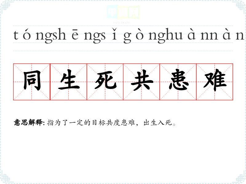 | 同休共戚 | ①指同欢乐共忧患。形容关系密切,利害一致。②偏指共患难。亦作“同休等戚”。 |