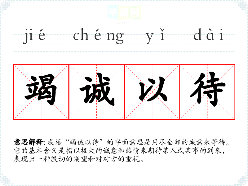 成语“竭诚以待”的字面意思是用尽全部的诚意来等待。它的基本含义是指以极大的诚意和热情来期待某人或某事的到来,表现出一种殷切的期望和对对方的重视。