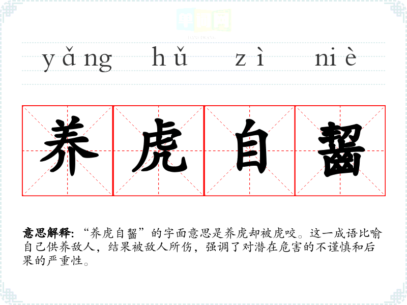 “养虎自齧”的字面意思是养虎却被虎咬。这一成语比喻自己供养敌人,结果被敌人所伤,强调了对潜在危害的不谨慎和后果的严重性。