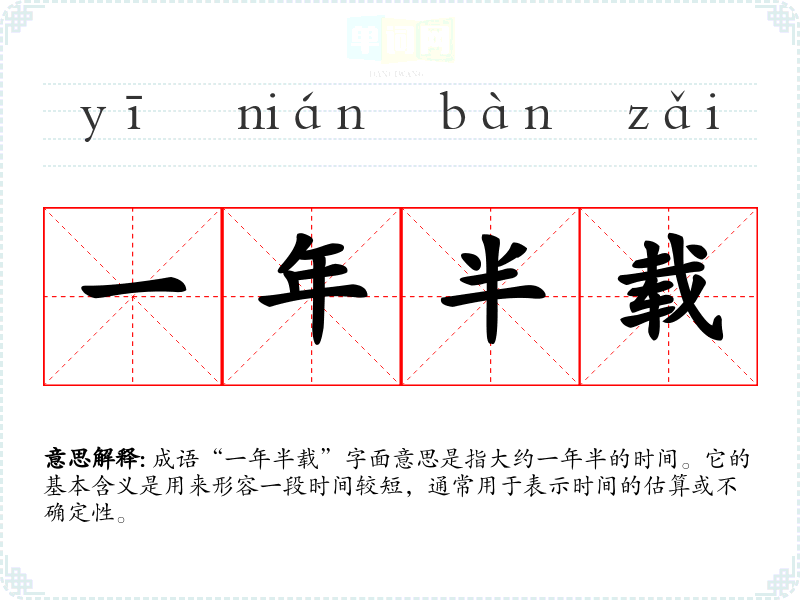 成语“一年半载”字面意思是指大约一年半的时间。它的基本含义是用来形容一段时间较短,通常用于表示时间的估算或不确定性。
