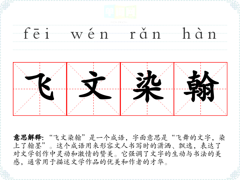 “飞文染翰”是一个成语,字面意思是“飞舞的文字,染上了翰墨”。这个成语用来形容文人书写时的潇洒、飘逸,表达了对文学创作中灵动和激情的赞美。它强调了文字的生动与书法的美感,通常用于描述文学作品的优美和作者的才华。