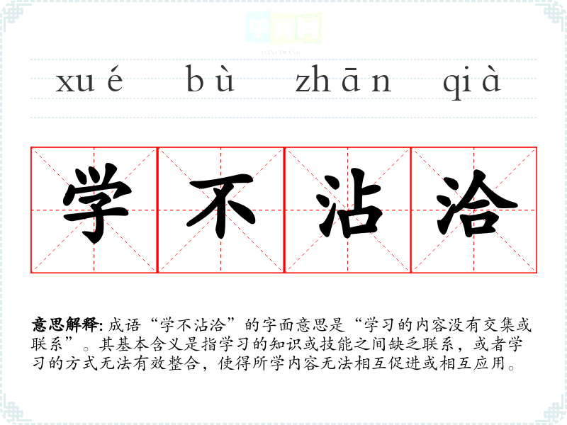 成语“学不沾洽”的字面意思是“学的内容没有交集或联系”。其基本含义是指学的知识或技能之间缺乏联系,或者学*的方式无法有效整合,使得所学内容无法相互促进或相互应用。