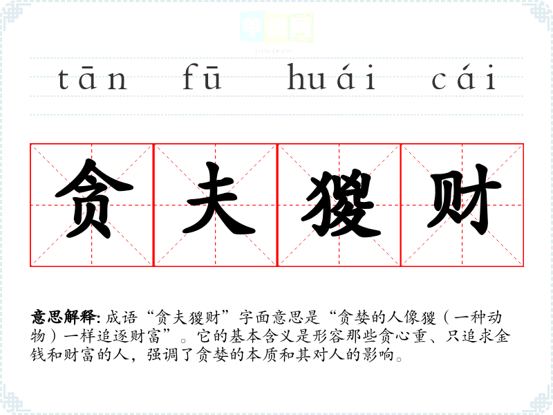 成语“贪夫猣财”字面意思是“贪婪的人像猣(一种动物)一样追逐财富”。它的基本含义是形容那些贪心重、只追求金钱和财富的人,强调了贪婪的本质和其对人的影响。