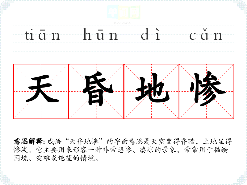 成语“天昏地惨”的字面意思是天空变得昏暗,土地显得惨淡。它主要用来形容一种非常悲惨、凄凉的景象,常常用于描绘困境、灾难或绝望的情境。