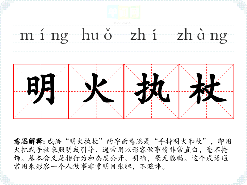 明火持杖 形容公开抢劫或肆无忌惮地干坏事。同“明火执仗”。