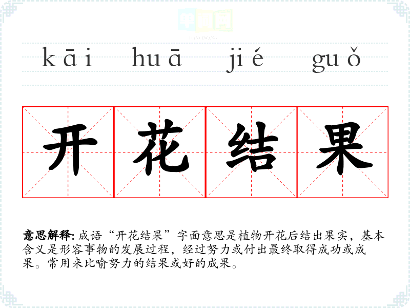 | 开华结果 | 比喻修养、学习、工作等有了成绩,取得效果。 |