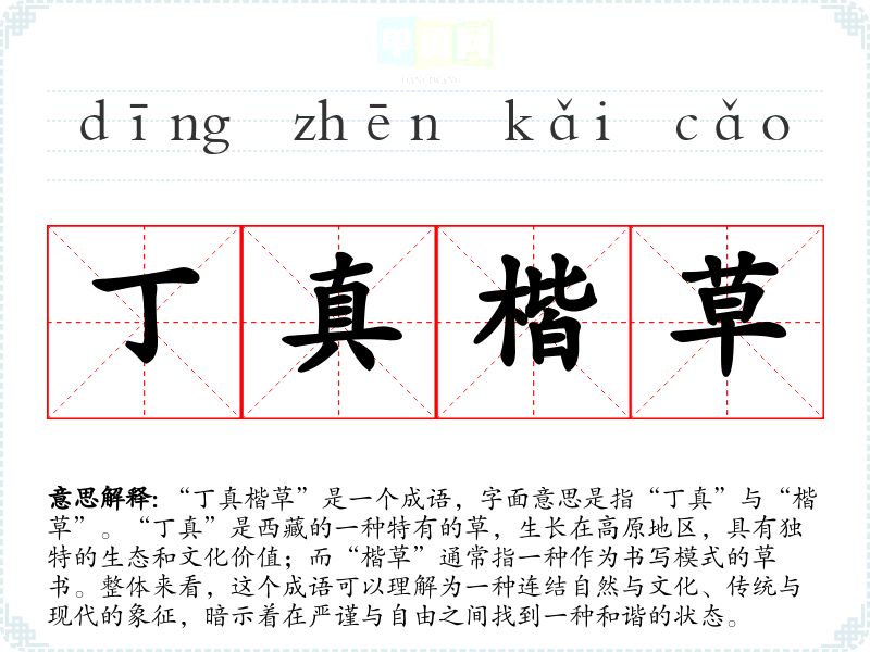“丁真楷草”并不是一个传统的成语,而是近年来随着网络文化的传播而产生的词汇,尤其在与丁真相关的网络热门话题中出现。丁真作为一位**的年轻人,因其阳光的形象和对传统文化的传承而受到广泛关注。这个词汇的出现,反映了当代社会对传统与现代、自然与文化交融的追求。