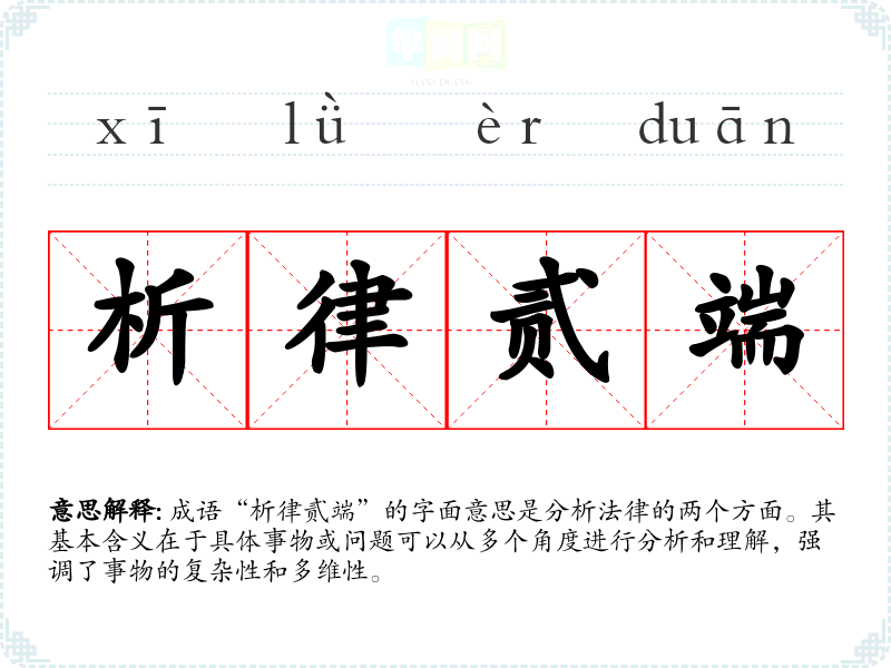 成语“析律贰端”的字面意思是分析法律的两个方面。其基本含义在于具体事物或问题可以从多个角度进行分析和理解,强调了事物的复杂性和多维性。