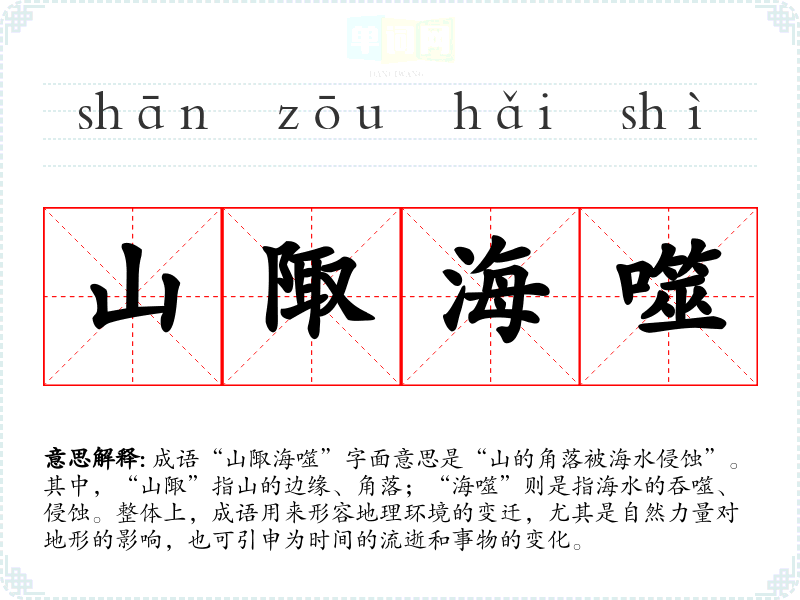 成语“山陬海噬”字面意思是“山的角落被海水侵蚀”。其中,“山陬”指山的边缘、角落;“海噬”则是指海水的吞噬、侵蚀。整体上,成语用来形容地理环境的变迁,尤其是自然力量对地形的影响,也可引申为时间的流逝和事物的变化。