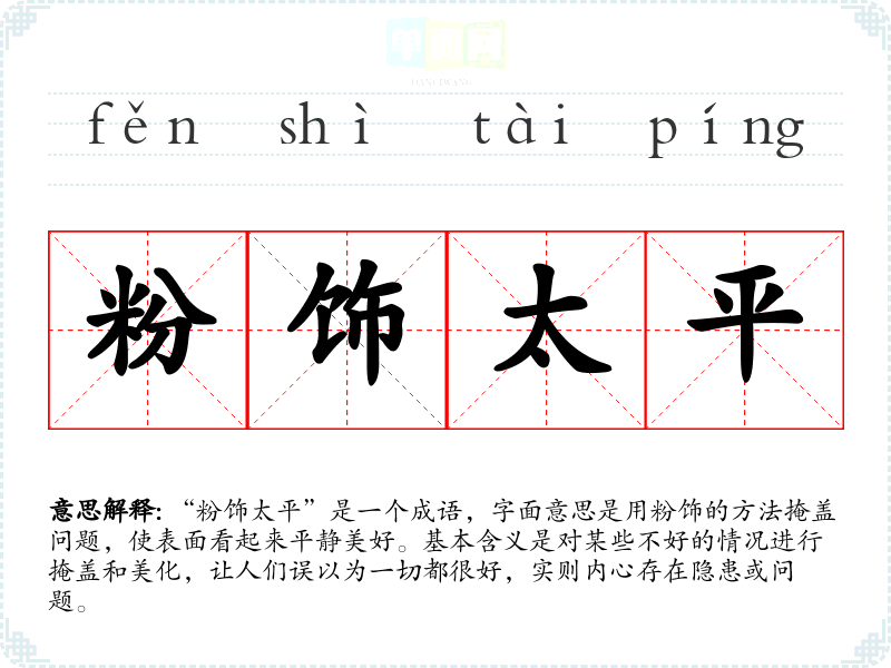 “粉饰太平”是一个成语,字面意思是用粉饰的方法掩盖问题,使表面看起来平静美好。基本含义是对某些不好的情况进行掩盖和美化,让人们误以为一切都很好,实则内心存在隐患或问题。