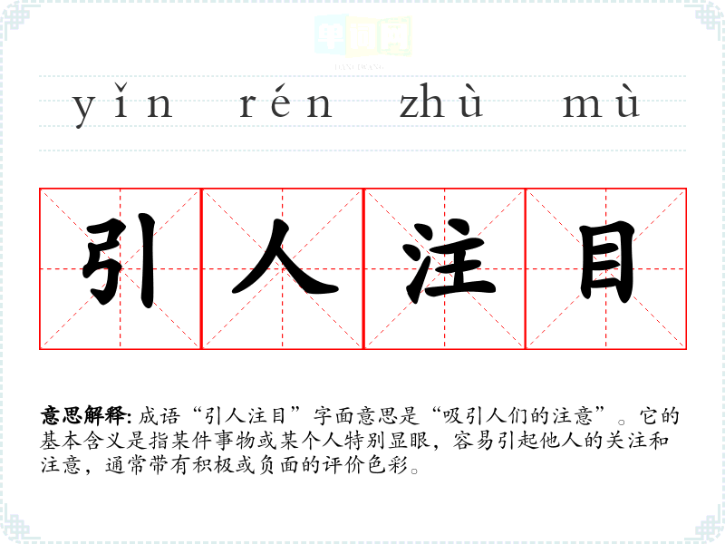 成语“引人注目”字面意思是“吸引人们的注意”。它的基本含义是指某件事物或某个人特别显眼,容易引起他人的关注和注意,通常带有积极或负面的评价色彩。
