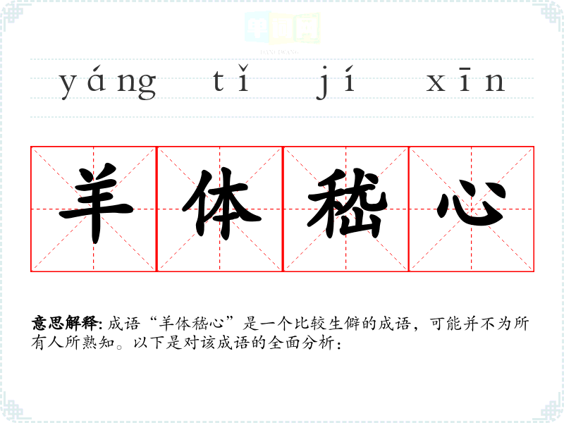 成语“羊体嵇心”是一个比较生僻的成语,可能并不为所有人所熟知。以下是对该成语的全面分析: