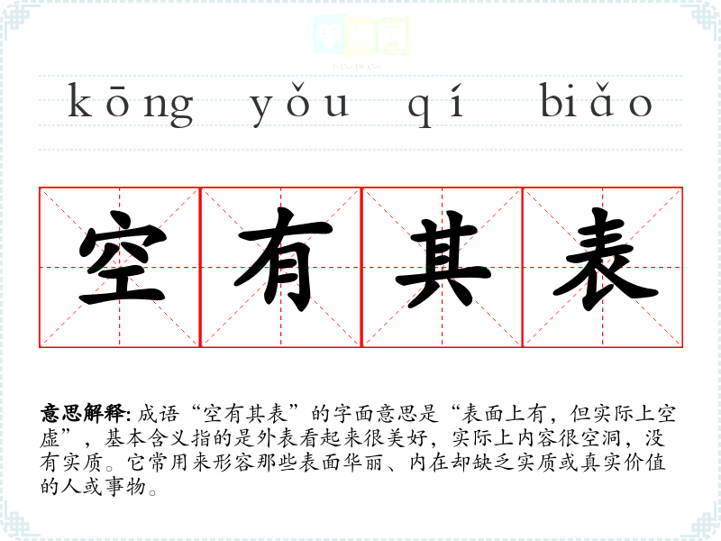 成语“空有其表”的字面意思是“表面上有,但实际上空虚”,基本含义指的是外表看起来很美好,实际上内容很空洞,没有实质。它常用来形容那些表面华丽、内在却缺乏实质或真实价值的人或事物。