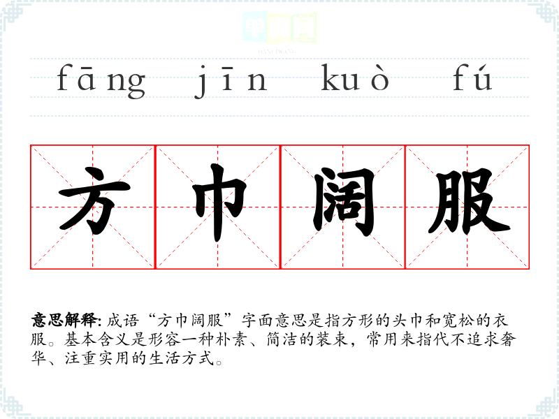 成语“方巾阔服”字面意思是指方形的头巾和宽松的衣服。基本含义是形容一种朴素、简洁的装束,常用来指代不追求奢华、注重实用的生活方式。