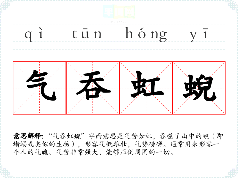 “气吞虹蜺”字面意思是气势如虹,吞噬了山中的蜺(即蜥蜴或类似的生物),形容气概雄壮,气势磅礴。通常用来形容一个人的气魄、气势非常强大,能够压倒周围的一切。