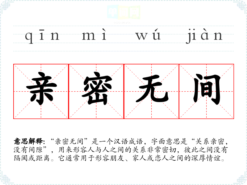 “亲密无间”是一个汉语成语,字面意思是“关系亲密,没有间隙”,用来形容人与人之间的关系非常密切,彼此之间没有隔阂或距离。它通常用于形容朋友、家人或恋人之间的深厚情谊。