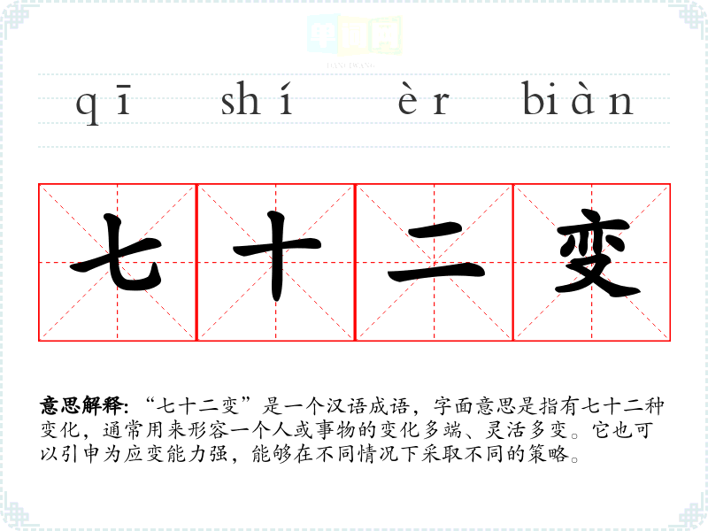 “七十二变”是一个汉语成语,字面意思是指有七十二种变化,通常用来形容一个人或事物的变化多端、灵活多变。它也可以引申为应变能力强,能够在不同情况下采取不同的策略。