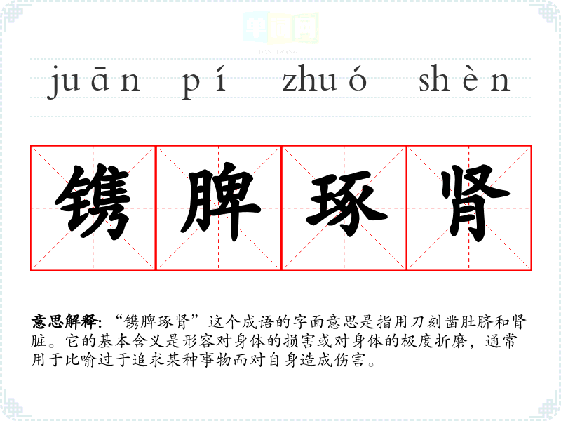 “镌脾琢肾”这个成语的字面意思是指用刀刻凿肚脐和肾脏。它的基本含义是形容对身体的损害或对身体的极度折磨,通常用于比喻过于追求某种事物而对自身造成伤害。