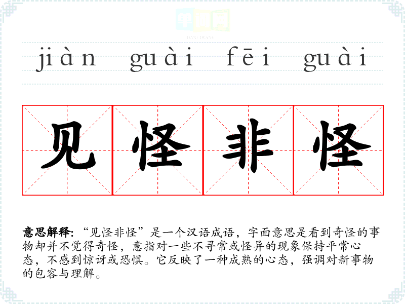 “见怪非怪”是一个汉语成语,字面意思是看到奇怪的事物却并不觉得奇怪,意指对一些不寻常或怪异的现象保持平常心态,不感到惊讶或恐惧。它反映了一种成熟的心态,强调对新事物的包容与理解。