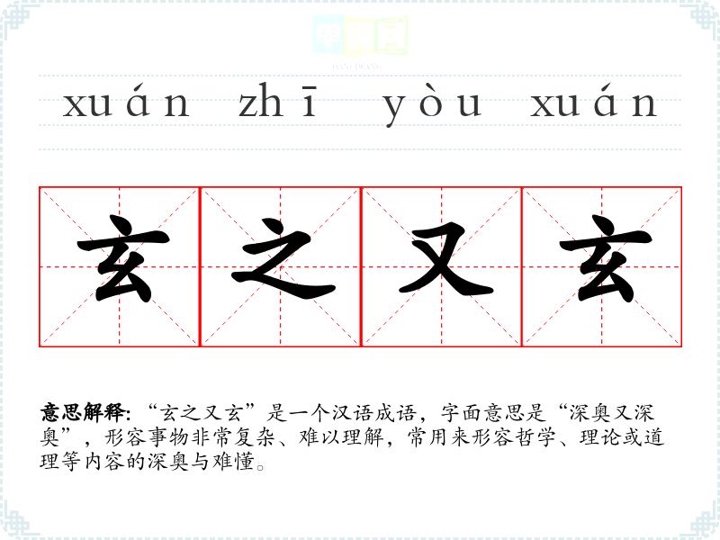 “玄之又玄”是一个汉语成语,字面意思是“深奥又深奥”,形容事物非常复杂、难以理解,常用来形容哲学、理论或道理等内容的深奥与难懂。