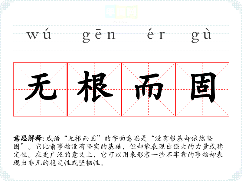 成语“无根而固”的字面意思是“没有根基却依然坚固”。它比喻事物没有坚实的基础,但却能表现出强大的力量或稳定性。在更广泛的意义上,它可以用来形容一些不牢靠的事物却表现出非凡的稳定性或坚韧性。